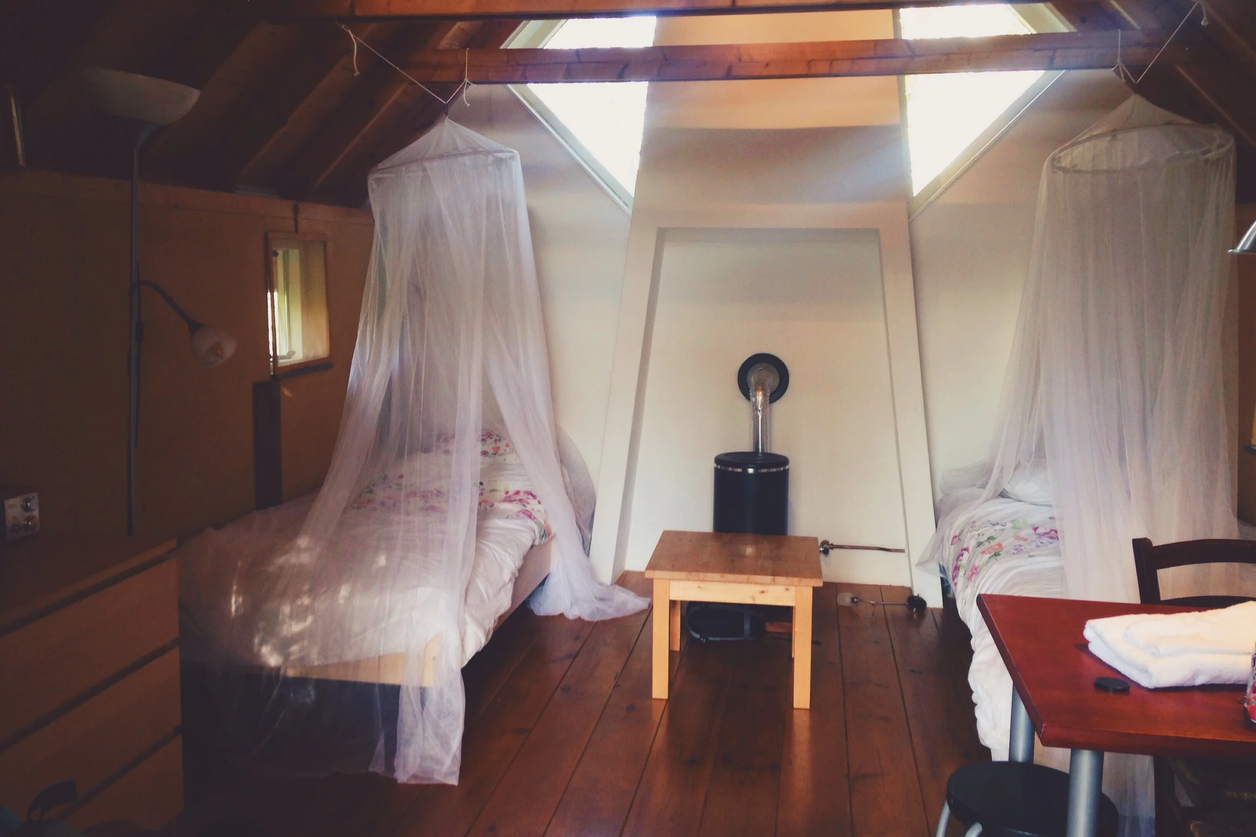 Het blijkt dat we bij het Kampeerbosje met onze neuzen in de boter vallen door vanavond een trekkershut uit te proberen. Terwijl eigenaren Hennie en Anita ons rondleiden vertellen ze dat de trekkershutten basic maar toch best luxe zijn. We hebben geen idee wat we kunnen verwachten terwijl we door een prachtige zee van herfstbladeren lopen. Na een korte rondleiding gaan we op ontdekking uit. Niet buiten, maar binnen! Wat we daar aantreffen is alles wat we helemaal niet hadden verwacht bij een trekkershut. Een kacheltje? Een keukenblok? Wij dachten van tevoren dat we hier in het hart van november onszelf zouden moeten opwarmen boven een zelf gestookt vuurtje, maar niets blijkt minder waar. Wat een heerlijk herfstig huisje hier midden in de natuur van Leerdam!