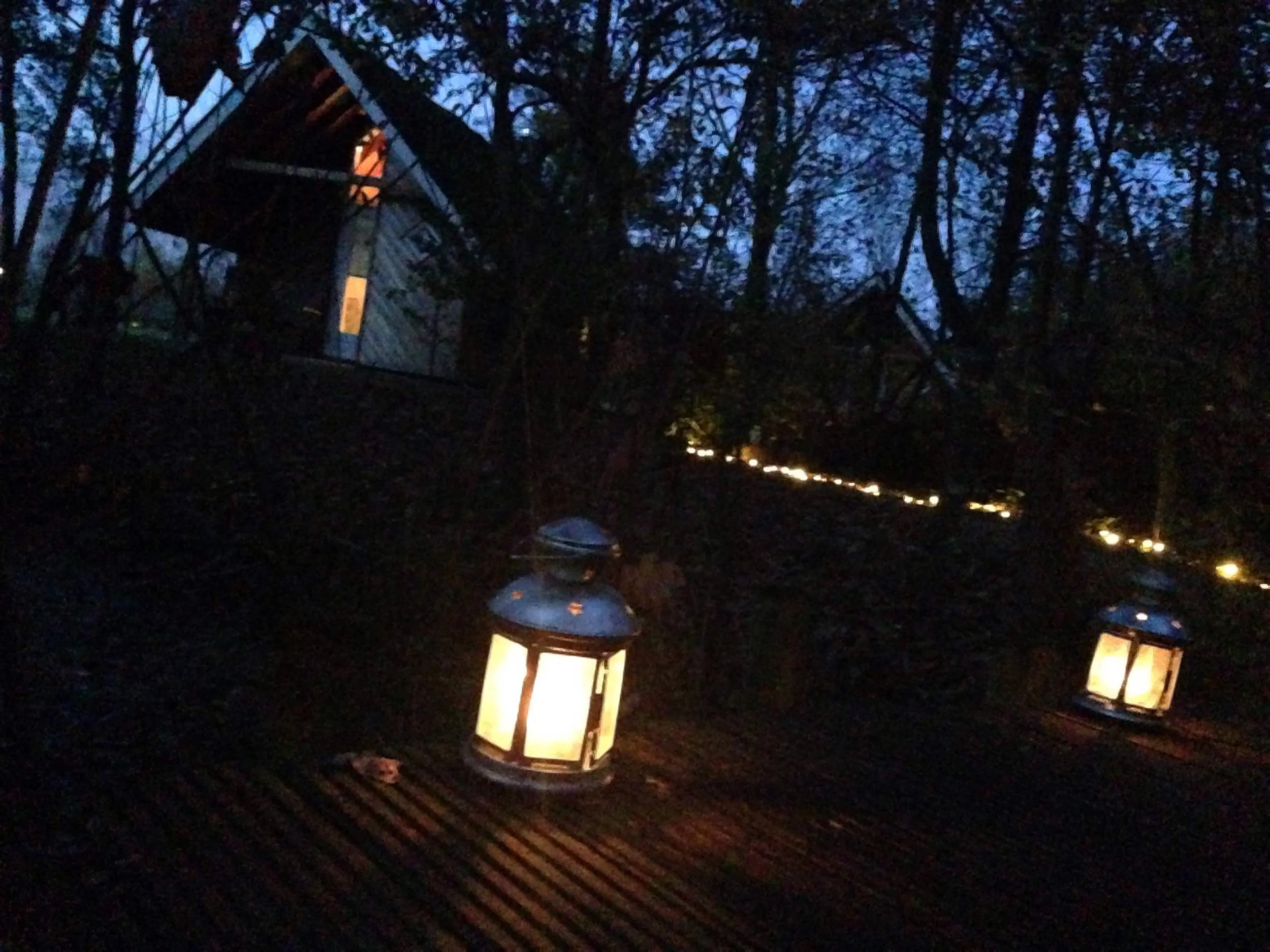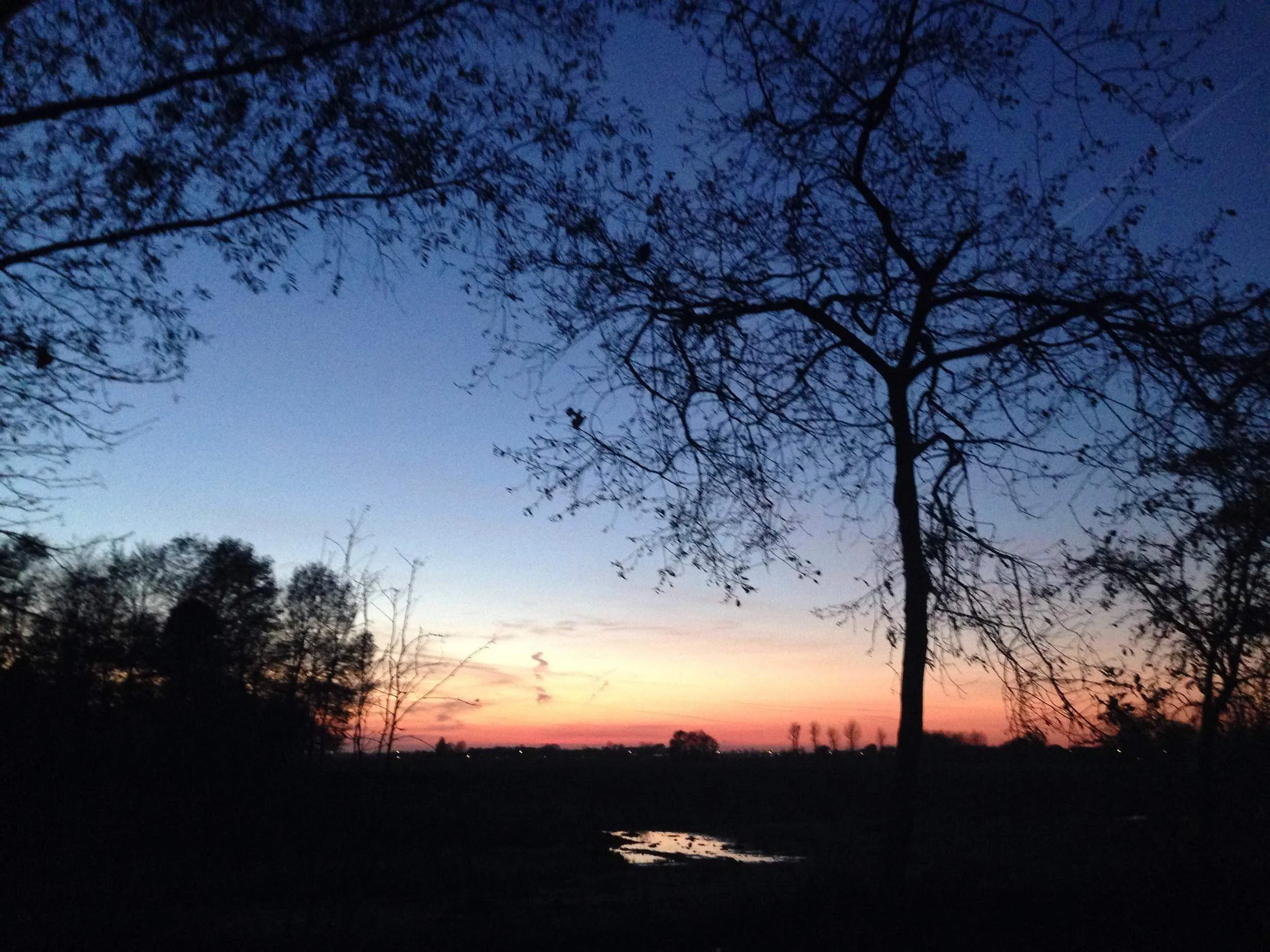We komen tijdens ons verblijf dan ook niet verder dan het Kampeerbosje en onze geweldige trekkershut. En dat hoeft ook helemaal niet. Terwijl we op andere plekken urenlang prachtige omgevingen aan het ontdekken zijn lopen we hier op het kleine eilandje tussen uitgestrekte gras- en landbouwvelden en voelen ons best wel ver van de bewoonde wereld. Met de zon vol in ons gezicht ontdekken we de verschillende slaapplekken op het terrein. Er zijn drie trekkershutten, er is een pipowagen (alweer!) en er zijn een aantal plekken voor je tent. Het natuurkampeerterrein was in eerste instantie jaren geleden gewoon een veldje. Hennie en Anita hebben het door de jaren heen opgebouwd, bomen geplant en zien groeien, romantische paden met verlichting aangelegd die naar de gezellige trekkershutten leiden en zelf bruggen gebouwd om het plekje zoveel mogelijk sfeer te geven. Dat is meer dan gelukt. Voor we ons terugtrekken in ons warme hol zien we de lucht veranderen in een prachtig schilderij met tientallen verschillende kleuren terwijl de zon ondergaat over de uitgestrekte Nederlandse velden. Terwijl we teruglopen zijn lantaarns en lichten langs de paden aangestoken en lijkt het Kampeerbosje een heus sprookjesbos. Het enige geluid wat we horen komt van voorbijtrekkende vogels en ganzen die in het avondrood als een bewegend silhouet op het schilderij zijn geplakt. De sterren die langzaamaan aan de hemel verschijnen zien we goed door de takken die nu toch hun bladeren al bijna helemaal verloren zijn. Het is tijd om lekker naar binnen te gaan en de kachel goed te laten branden.