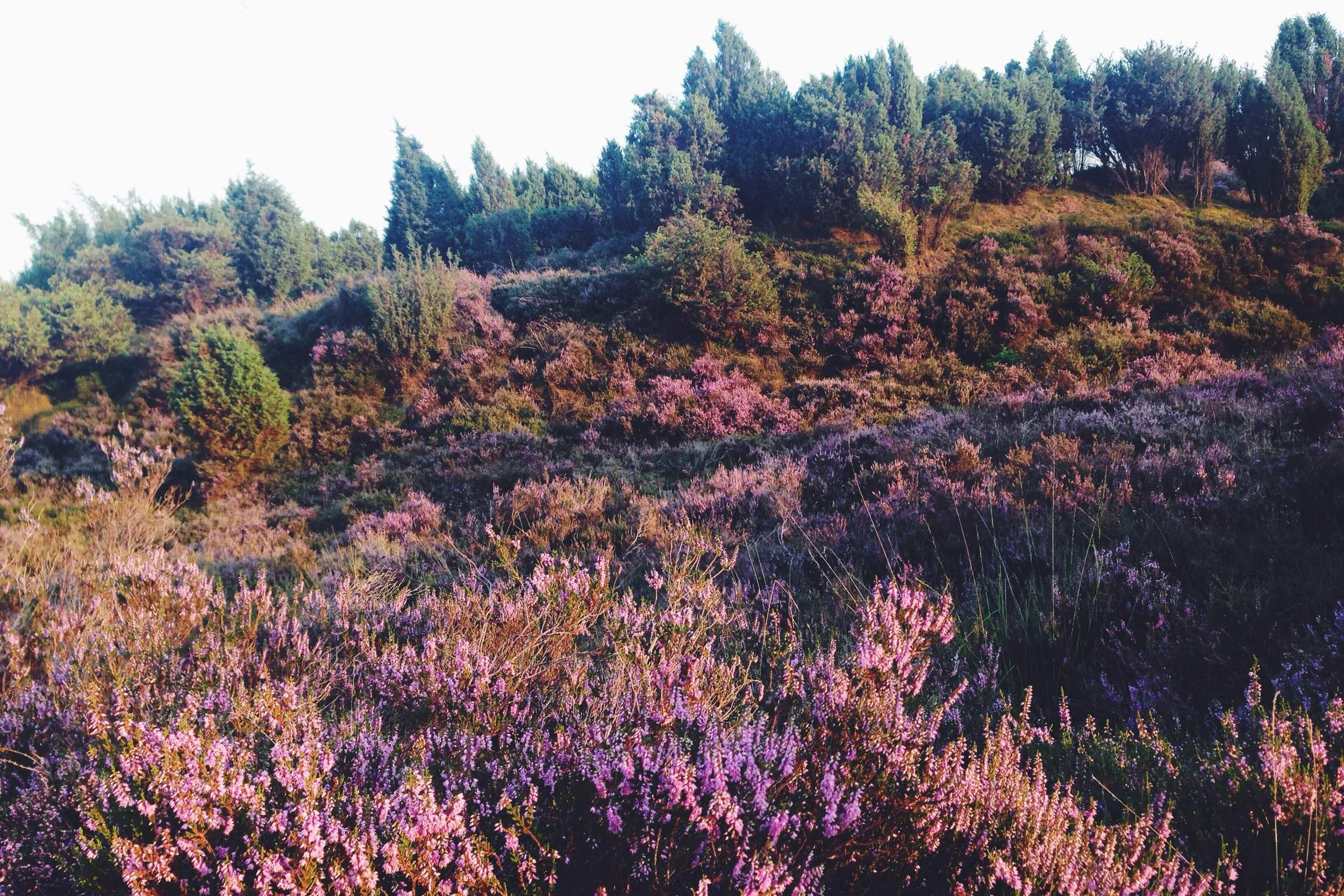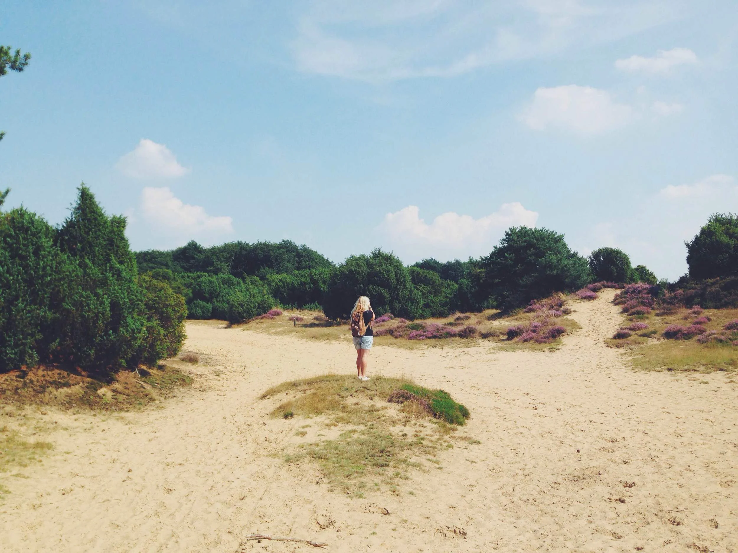 "Waarom voel ik me alsof ik een personage ben in Alice in Wonderland?" Dat is het eerste wat in ons opkomt wanneer we de paarse heide van het Mantingerzand betreden. Er zijn kleine ronde bomen, hoge bomen, kleurrijke bosjes, plekken met witte zandbakken en oneindige paarse heidevlakten. Nu nog wachten tot er ergens een pratend konijn om de hoek verschijnt en het plaatje klopt helemaal. De omgeving bij Mantinge is sprookjesachtig. Dit merken we des te meer wanneer we na het avondeten nog besluiten om een wandeling tijdens zonsondergang te maken door het gebied. De kleuren lijken nu nóg mooier! Het is er in de avond wel heel eenzaam, we komen niemand tegen. Iets wat juist heel fijn is, maar ook iets wat iets spannends heeft. We schrikken dan niet voor niets als we in het bos ineens het geluid van een soort megaharde wind horen. Dat kan toch helemaal niet? De lucht is strakblauw en er stond net geen zuchtje wind. Wanneer we omhoog kijken blijkt het een vogeltrek te zijn met wel honderden vogels. Wat een intens geluid! We hebben vaker zwermen vogels voorbij zien vliegen maar dit is echt een bizarre ervaring.