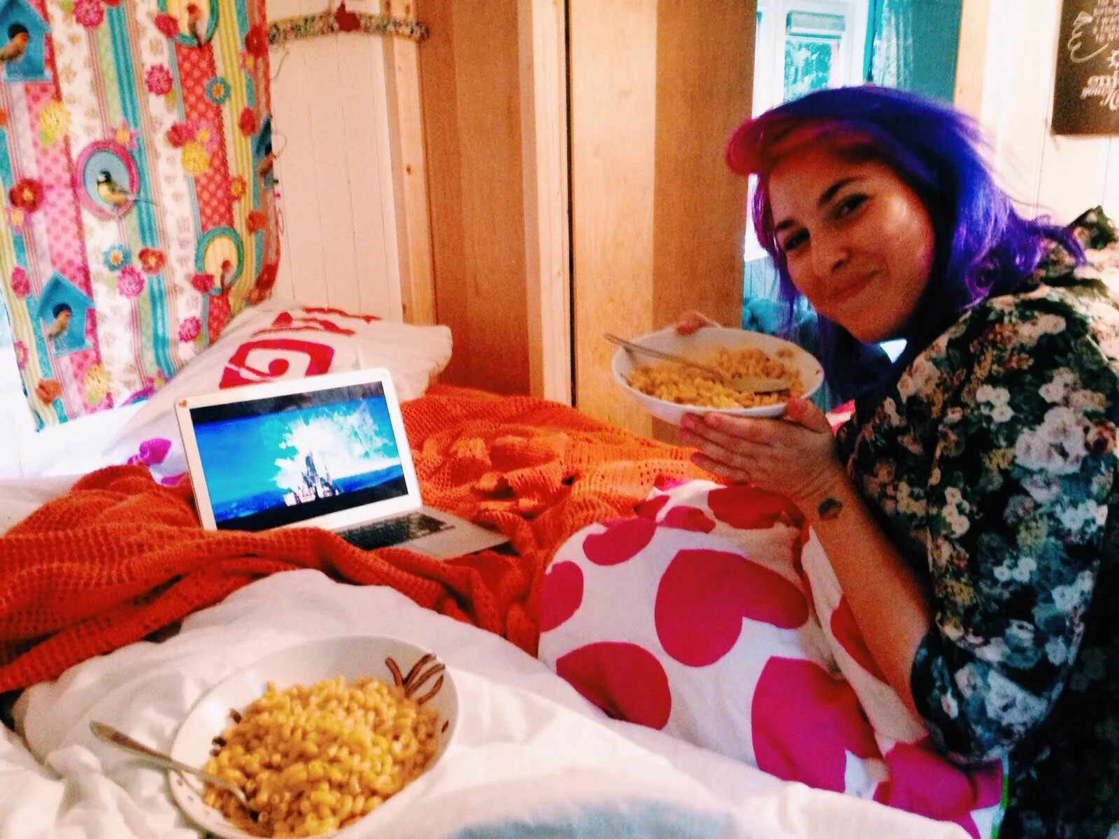 De rust en stilte van het park geeft ons geen prikkels om andere dingen te doen dan binnen in de knusse pipowagen te blijven en te praten, te eten en films te kijken. En dat is precies wat we doen de rest van de dag. Terwijl het tikken van de regen op het dak de sfeer alleen maar gezelliger maakt kunnen we ons goed voorstellen dat de pipowagen een perfecte plek is voor mensen die even een dag of twee aan de drukte van de stad willen ontsnappen en gewoon met een boek of, zoals wij, met de Disney film Frozen, tot rust willen komen. Niks moet, en dat is wel eens fijn. Er zijn geen verleidingen om je laptop te pakken en wat te werken, geen behoefte om even je mail te checken en geen dagelijkse zorgen. We merken heel erg dat we de buitenwereld totaal loslaten en helemaal opgaan in dat waar we zijn; alleen in een pipowagen midden op de Veluwe.