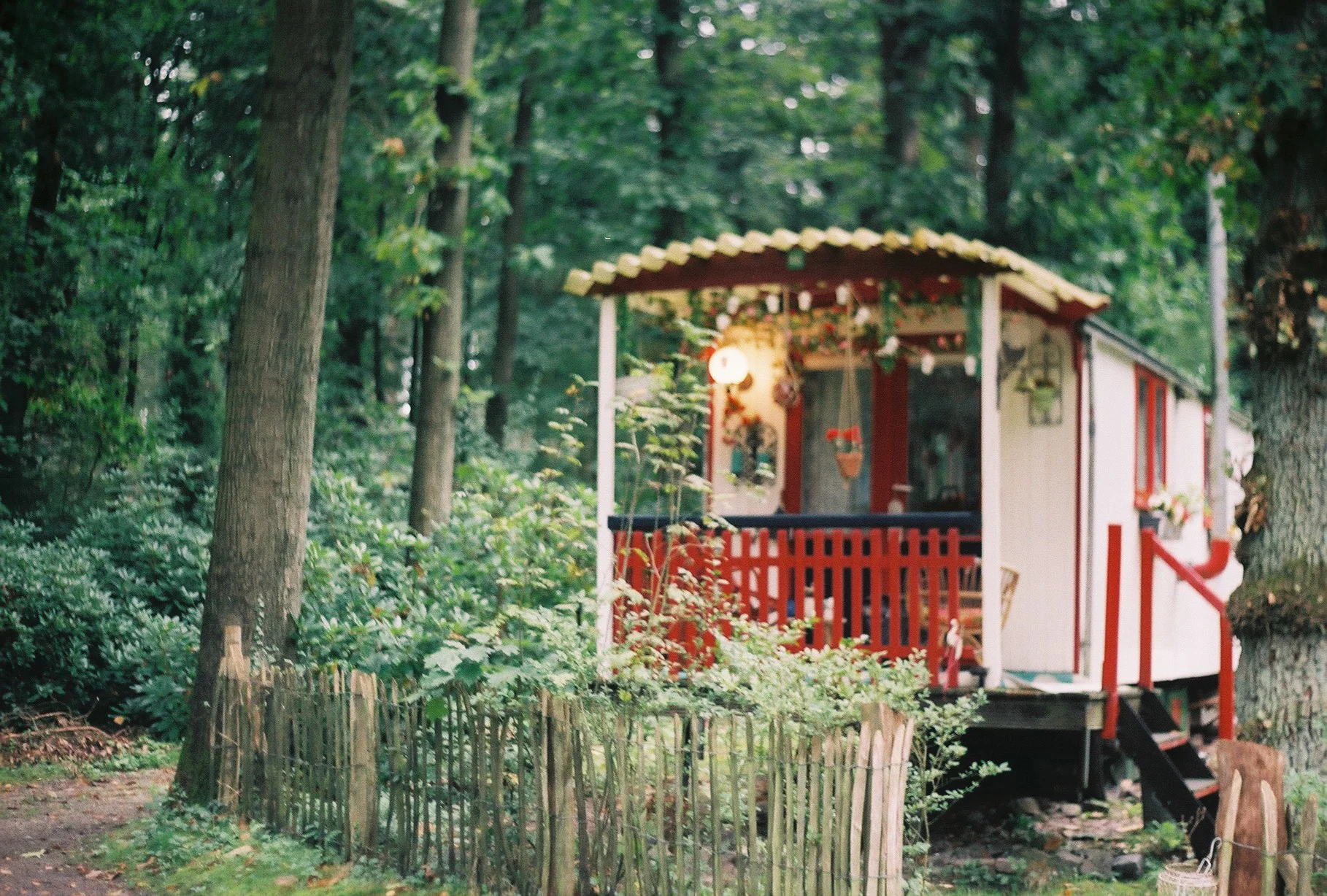 Na tien minuten razen zitten we in de opening van onze bedstee (jazeker, bedstee!) en kijken we nog eens om ons heen. Op bijna elke centimeter van de pipowagen is iets tofs te bekijken: vintage potten en pannen, spreuken op de muur, kattenbeeldjes, flamingoprints en prachtige gordijnen. Terwijl de regen tikt op het dak alsof we in een tent zitten voelt het ook wel echt als een kampeerplek. Buiten is het geweldige badhuis waar het toilet en de douche in te vinden zijn. Het loopje ernaartoe heeft al een kampeervibe, laat staan de kampvuurkuil die je onderweg tegenkomt. Dat laatste zouden we super graag willen gebruiken om de heksenketel van Nienke boven te hangen zodat we warme chocomelk kunnen maken, maar de herfst neemt de leiding vandaag. Terwijl de gekleurde bladeren vallen en de regen de hele dag aan blijft houden is de pipowagen het gezelligste plekje op de Veluwe. Kacheltje aan, wifi afwezig en terwijl we vanaf de veranda naar binnen en buiten kijken knijpen we onszelf even: hoezo is deze pipowagen niet constant volgeboekt?