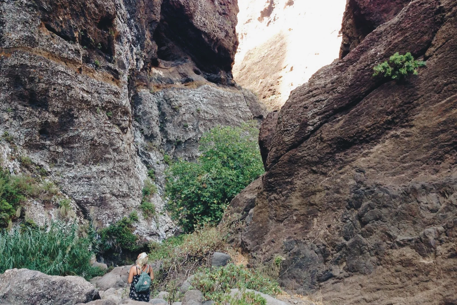 Na een hobbelige maar supermooie autorit sta je ineens boven in Masca, een gezellig dorpje met enkele restaurants en een paar mooie uitzichtpunten. Omdat we van tevoren nog niet exact wisten of we deze trekking gingen doen hadden we onze bergschoenen thuis gelaten en staan we hier met sneakers en frisse moed bovenaan om aan de tocht te beginnen. Een bepakt en bezakt duo met uitrusting, sportkleding en grote bergschoenen stapt ons enthousiast voorbij. Staan we dan in onze korte broek, jurkje en standaard sneakers. Komt wel goed. Toch?