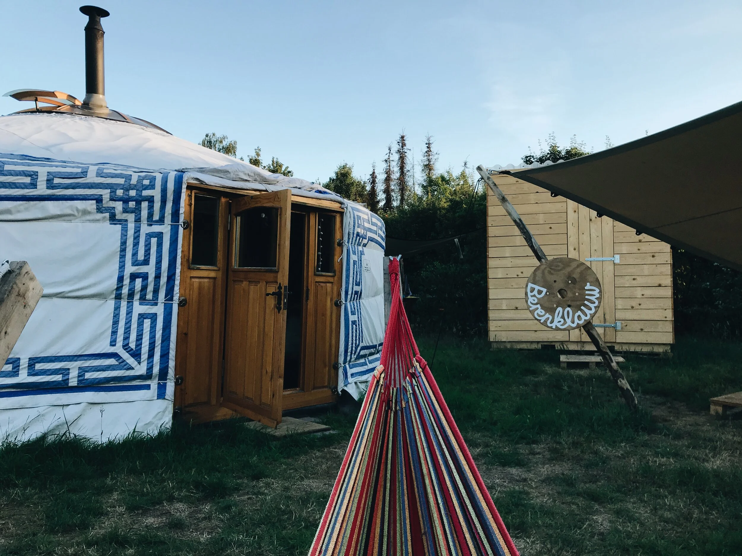 We begonnen onze midweek in de kleurrijke Grote Yurt - Berenklauw, wát een pracht van een tent. In en buiten deze tent is aan alles gedacht: te gekke vintage meubels en accessoires die je kunt kopen, talloze schapenvellen, een heerlijk bed in het midden van de tent en buiten een overdekt zitje met bankjes. Ik heb sowieso iets met yurts en vind de hele geschiedenis ervan ontzettend interessant. Het lijkt me dan ook supertof om dit soort woontenten eens in het echt (en niet op de camping) te mogen aanschouwen. Bij de Grote Yurt zit, net als bij de andere accommodaties, eigen sanitair in een apart gebouwtje. Hoewel dat op het moment dat wij er sliepen niet meer verplicht was, vond ik het ideaal.