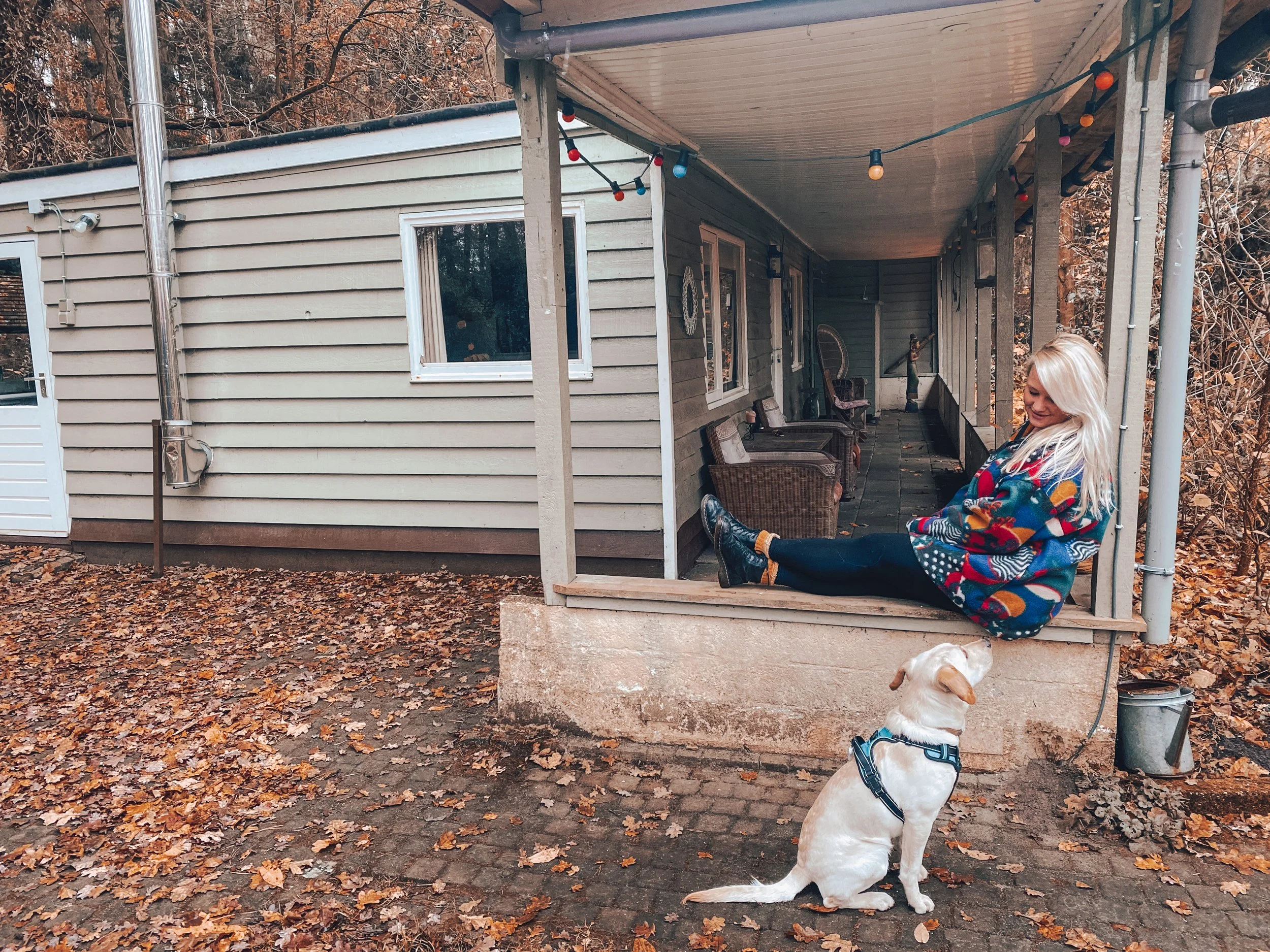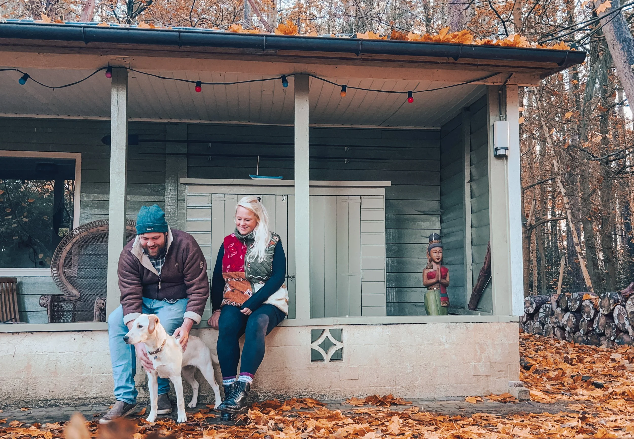 We kunnen niet zo snel stoelen of een bankje vinden voor bij het vuur dus we besluiten een tuinstoel en de grote pauwenstoel van de veranda bij het knisperende vuurtje te zetten. Ook nu horen we weer allerlei geritsel in de bosjes achter ons. Hoewel de doorgaande weg helemaal niet ver weg is, voel je je hier toch echt een beetje afgesloten van de wereld. En dat terwijl we door een paar kale bomen door de herfst gewoon zicht hebben op het grote huis van de buren. We spotten helaas geen wilde dieren tijdens ons verblijf, maar hebben wel écht een heerlijk weekend in en buiten het Boho Huisje.