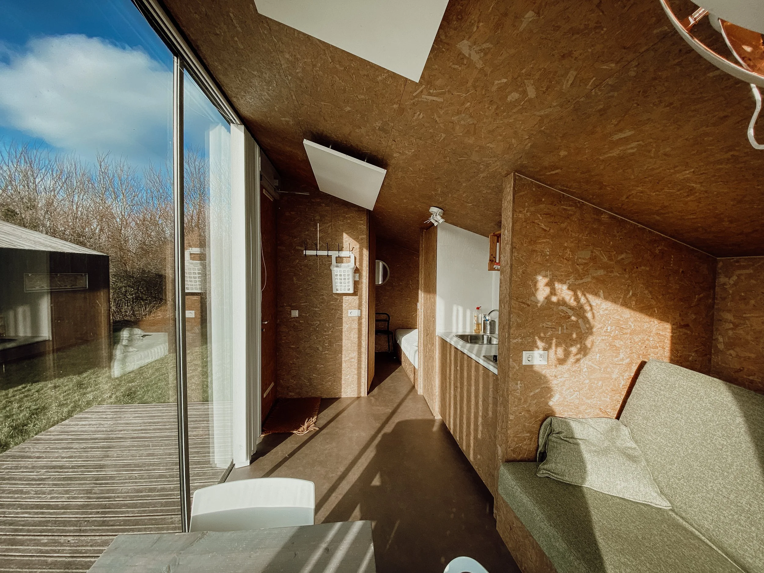 Trekkershutten worden vaak aangeboden als een comfortabel alternatief voor kamperen. Bij binnenkomst in trekkershut Borkum zie ik al meteen dat dit veel meer is dan dat. Ik zou hier zo een weekje willen werken. Of voor een tijdje kunnen wonen! De Waddenhuisjes zijn compleet ingericht voor vier personen. Er is een tweepersoonsbed te vinden en in het leefgedeelte staat nog een fijne bedbank die heerlijk zit (en ongetwijfeld net zo lekker ligt). Wij zijn hier met z’n tweetjes en met Jutter de hond dus genieten van alle ruimte voor onszelf. Zo voelt een tiny house nog best groots. Je hebt eigenlijk helemaal niet zoveel nodig om ergens te verblijven.