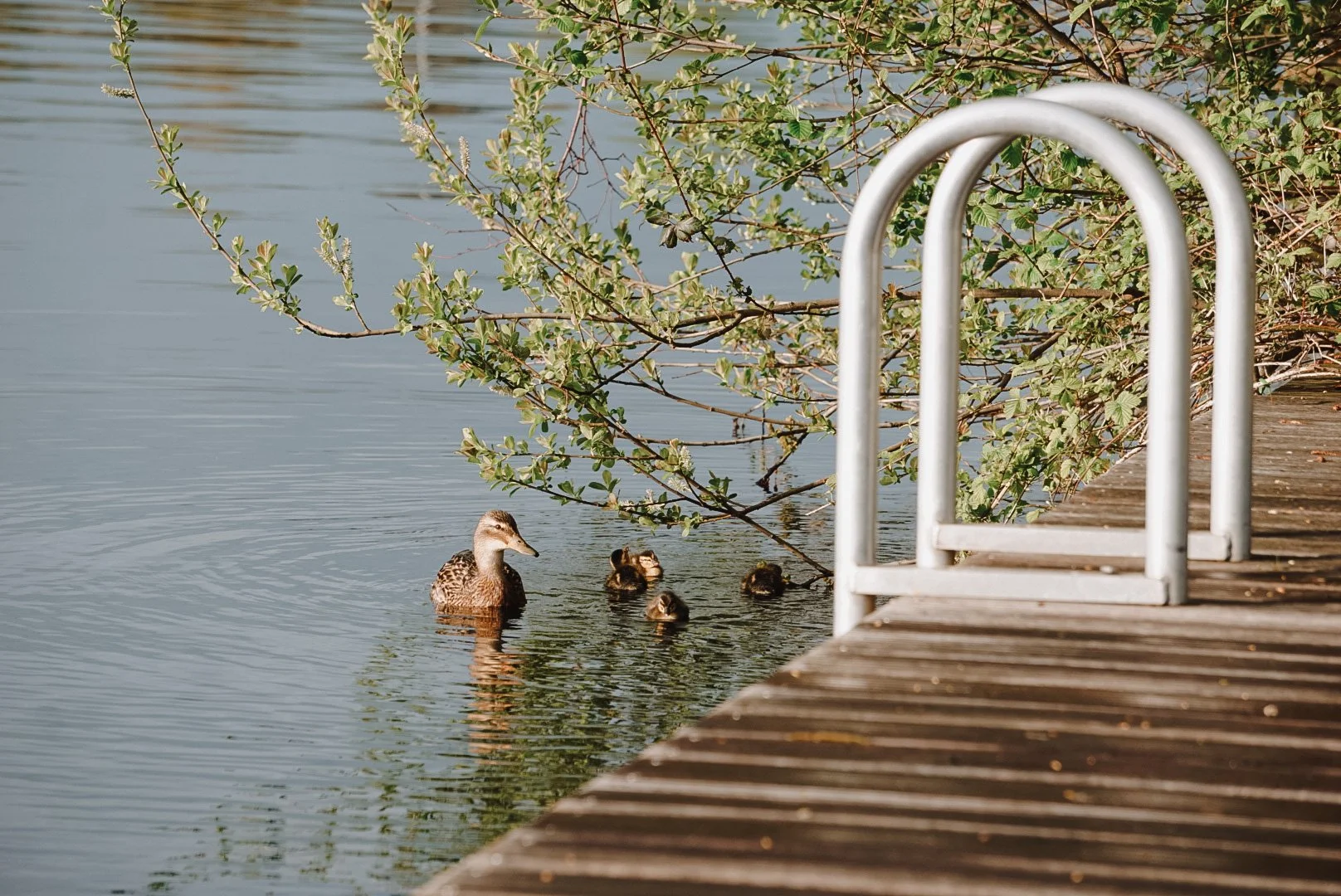 Hoewel we heel hard aan het genieten waren van de storm, de wind en de regen was het toch stiekem ook wel heel fijn toen we de laatste ochtend wakker werden zonder het geluid van keiharde wind rondom de hut. Zou de zon zich dan toch nog even laten zien? Voorzichtig doe ik de gordijnen open en zie ik een voorzichtig zonnetje op het water schitteren. De wereld slaapt nog, lijkt het, want het enige dat ik hoor is het geluid van eenden en vogels. Dat hebben we hier op geen enkele dag nog gehoord, wow! Pas nu hoor ik goed hoe de natuur hier leeft - en dat op slechts 30 minuten van huis waar we in de binnenstad van Utrecht wonen. Ik maak een kop koffie en besluit om gewoon even op de kade te zitten van het eilandje. Binnen no time krijg ik bezoek van eenden en hun kroost en zelfs een paar prachtige zwanen.